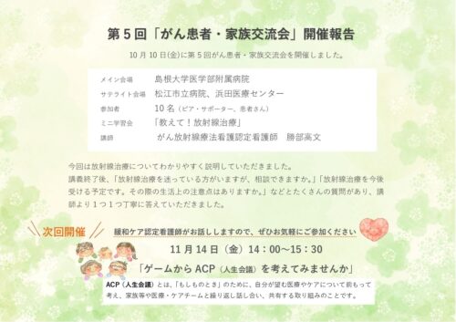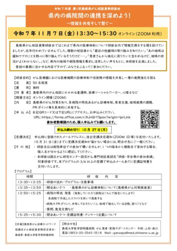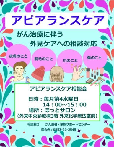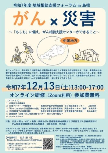 しまねのがんハンドブックがん患者さんやご家族に役立つ様々な情報をまとめています。 がんピア・サポートがんの治療体験者であるピア・サポーターが、自分の体験を生かし、患者さん・ご家族をサポートします。 治療と仕事の両立仕事についての相談に対応します。必要に応じて、相談会の紹介や、医療スタッフ・院外の専門職との連携を図ります。 がん相談員等研修会がん相談に携わる医療従事者の資質向上に向けた情報を発信しています。
