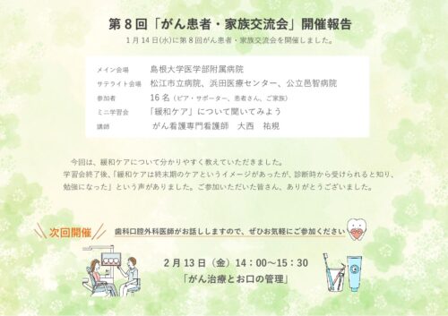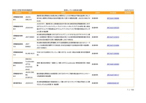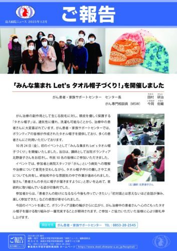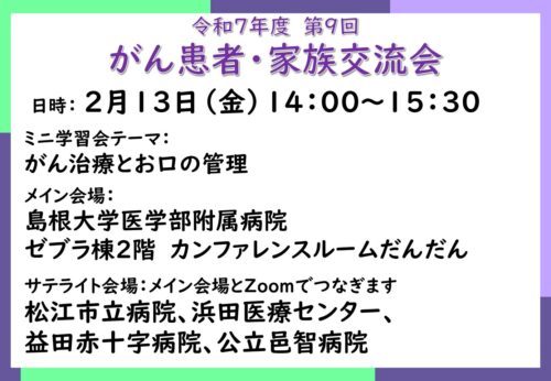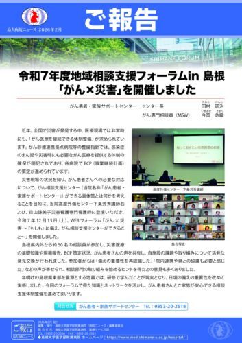 お知らせ 2026/01/27 がん患者・家族交流会ピア・サポート 第8回がん患者・家族交流会を開催しました(ミニ学習会配信中) 2026/01/21 がん患者・家族交流会ピア・サポート (サテライト会場)令和7年度 第9回がん患者・家族交流会を開催します 2026/01/09 臨床試験 当院で行っているがん臨床試験を更新しました。 2024/03/04 お知らせ 長期入院中の高校生の学習をサポートします お知らせ一覧