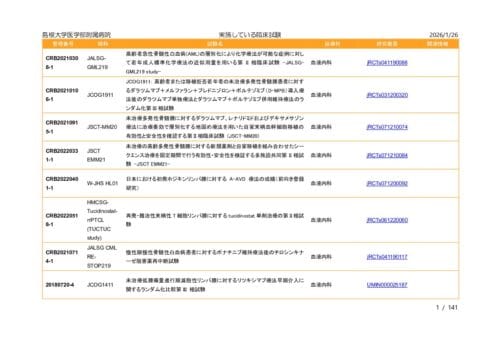 お知らせ 2026/02/19 臨床試験 当院で行っているがん臨床試験を更新しました。 2026/02/13 研修会 令和7年度地域相談支援フォーラムin島根「がん×災害」を開催しました 2026/02/13 アピアランスケア 「みんな集まれ!Let’sタオル帽子づくり」を開催しました 2024/03/04 お知らせ 長期入院中の高校生の学習をサポートします お知らせ一覧