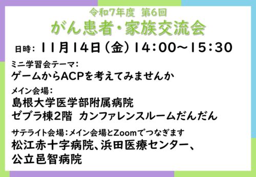 お知らせ 2025/10/29 がん患者・家族交流会ピア・サポート (サテライト会場)令和7年度 第6回がん患者・家族交流会を開催します 2025/10/29 がん患者・家族交流会ピア・サポート 第5回がん患者・家族交流会を開催しました(ミニ学習会配信中) 2025/10/15 臨床試験 当院で行っているがん臨床試験を更新しました。 2024/03/04 お知らせ 長期入院中の高校生の学習をサポートします お知らせ一覧